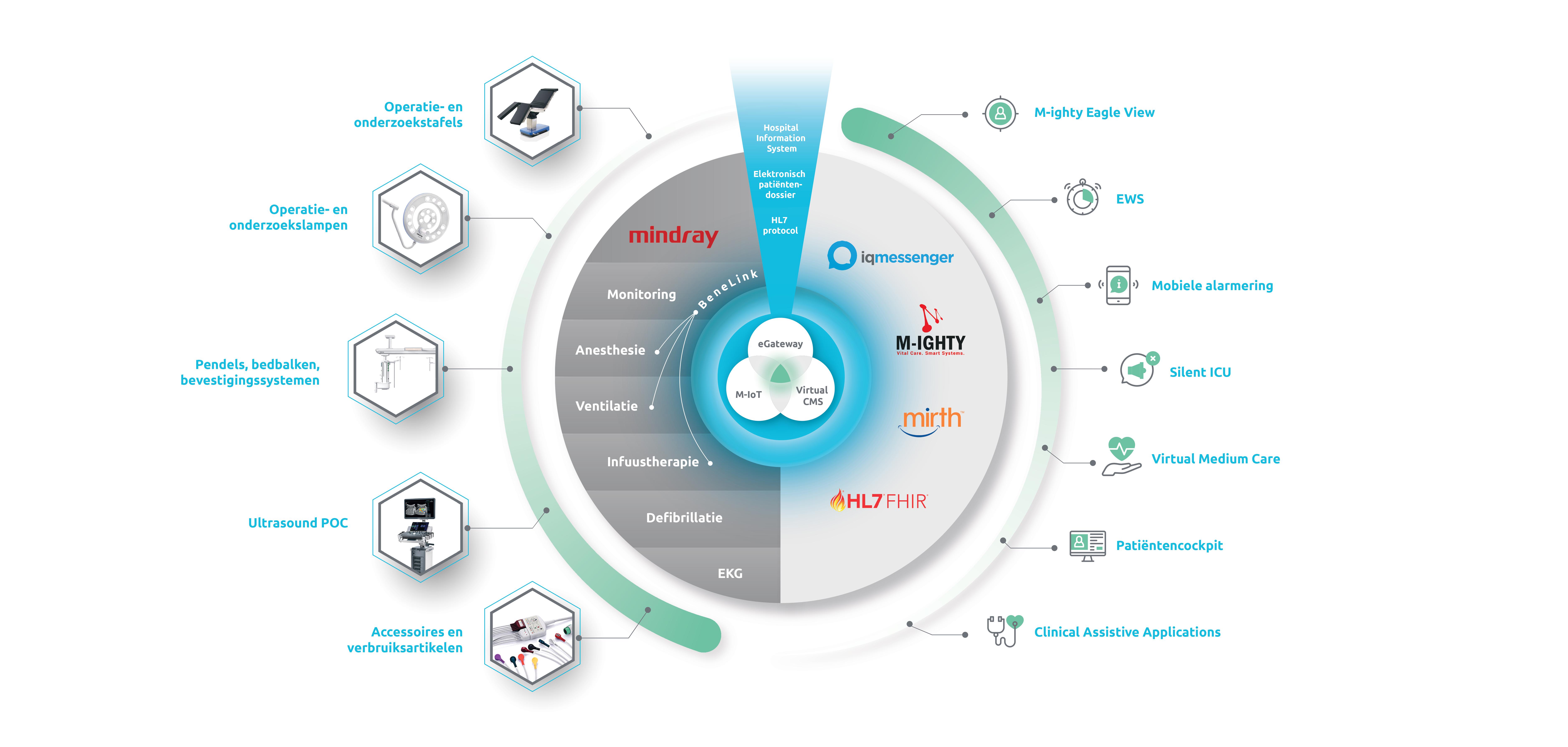 Al onze medische apparaten en software zijn geconnecteerd: ze communiceren met elkaar, met het ziekenhuisinformatiesysteem en met het patiëntendossier via een platform van virtuele componenten. Zo wordt één ecosysteem van klinische intelligentie gecreëerd met een explosie van mogelijkheden en toegevoegde waarde voor het ziekenhuis. De verzamelde data wordt inzichtelijker gemaakt en kan slim ingezet worden voor bv. medische analyses en diagnoses. En omdat alle gegevens overal, ook mobiel, en te allen tijde beschikbaar zijn, kunnen werkprocessen geoptimaliseerd worden.