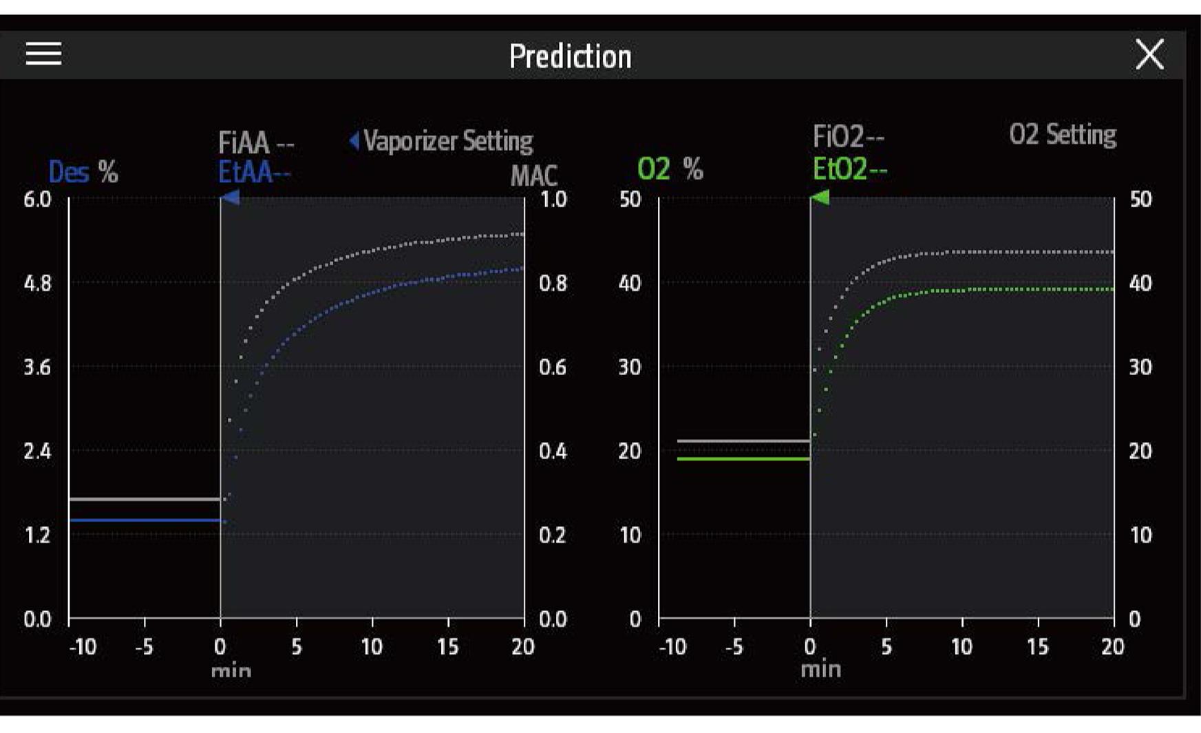 De voorspellingsfunctie helpt clinici de status van FiAA en EtAA voor de komende 20 minuten te voorspellen, en de status in de afgelopen 10 minuten te traceren. De volledige tijdstrend van AA is beschikbaar met de MAC-waarde.