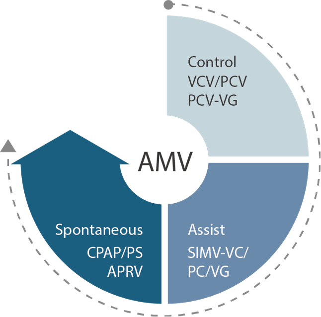 De Adaptive Minute Ventilation (AMV) modus maakt een eenvoudige omschakeling tussen gecontroleerde en spontane beademing zonder extra afstelling mogelijk.