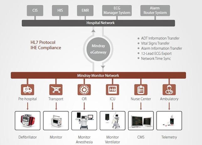 De eGateway zorgt voor probleemloze opname van gegevens van wel 200 patiëntmonitoren en functioneert als een enkele lijn waarmee patiëntgegevens efficiënt naar het medische elektronische dossier worden verzonden. Deze EMR-communicatie wordt bereikt door het gebruik van het open HL7-protocol en een configuratie-engine waarmee het elektronische medische dossier efficiënt en rendabel wordt ingevuld.