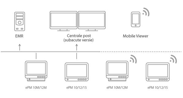 Mindray ePM-apparaten kunnen worden verbonden met het CMS en de eGateway via bedrade en draadloze netwerken, en kunnen via de directe HL7-uitgang aan EMR (Electronic Medical Records) van derden worden gekoppeld.