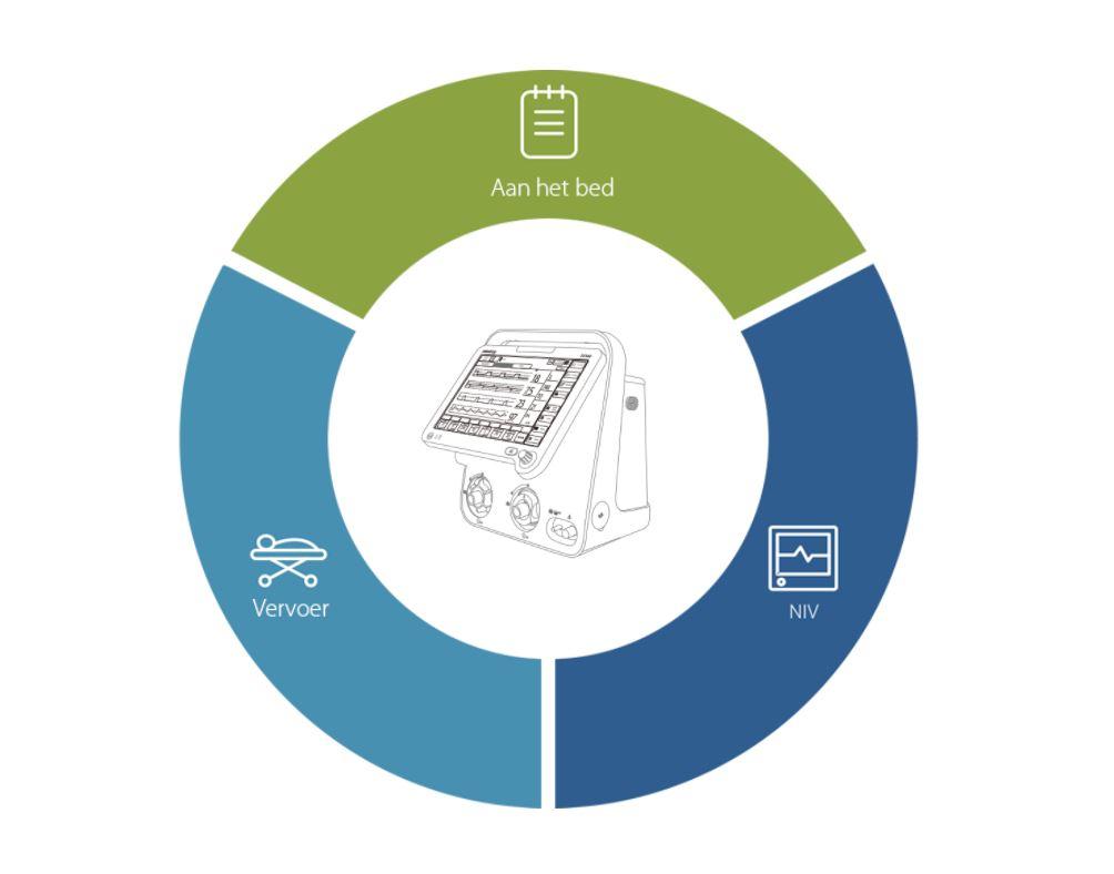 De uitgebreide lijst van standaardvoorzieningen, waaronder de nieuwste vormen van beademing, maakt de SV300 geschikt voor alle niveaus van patiëntenzorg en in alle zorgsituaties, van het bed van de patiënt tot vervoer naar een ander punt van zorg..