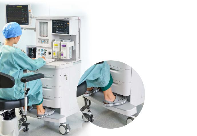 Met handig geplaatste handgrepen en soepel lopende zwenkwielen is de WATO EX-35 gemakkelijk op de werkplek te plaatsen. Het grote, gemakkelijk te reinigen werkoppervlak biedt voldoende ruimte voor het maken van notities, voor het plaatsen van medicatie en intubatieapparatuur, en een ergonomisch ontworpen voetsteun biedt de gebruikers totaal comfort, zelfs gedurende langere perioden.
