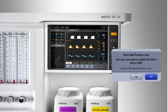 Veiligheid staat centraal bij alle apparaten van Mindray en de WATO EX-35 is daarop geen uitzondering. De geheel nieuwe auto-switch-functie van het beademingsgas zorgt ervoor dat de patiënt te allen tijde mechanisch wordt geventileerd, zelfs als de gastoevoer van het primaire beademingsapparaat uitvalt.